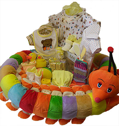 Baignoire Bébé Une baignoire remplie d’une collection abondante de jouets et vêtements, entourée par une longue chenille en peluche de 7 pieds. Ce cadeau extraordinaire serait faire un plongeon énorme. |
