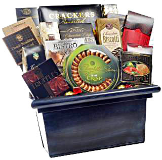 Doux Sentiments Une très belle façon de dire «je pense à toi». Un panier rempli de craquelins, gaufrettes au chocolat, biscottis, café moccacino, biscuits truffés, chocolats, truffes, pistaches, confiture Greaves, fromage à tartiner, fudge et chocolat Guylian. |